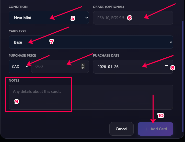9. Dans la section Notes, vous avez la possibilité d’ajouter des détails concernant votre carte, comme l’occasion de l’achat (salon de cartes, échange, etc.)