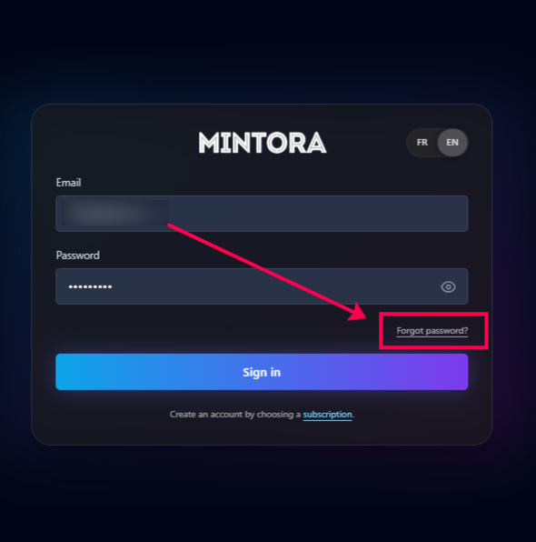 Click “Forgot password”, enter the email address linked to your Mintora account, and follow the instructions sent by email to create a new one.