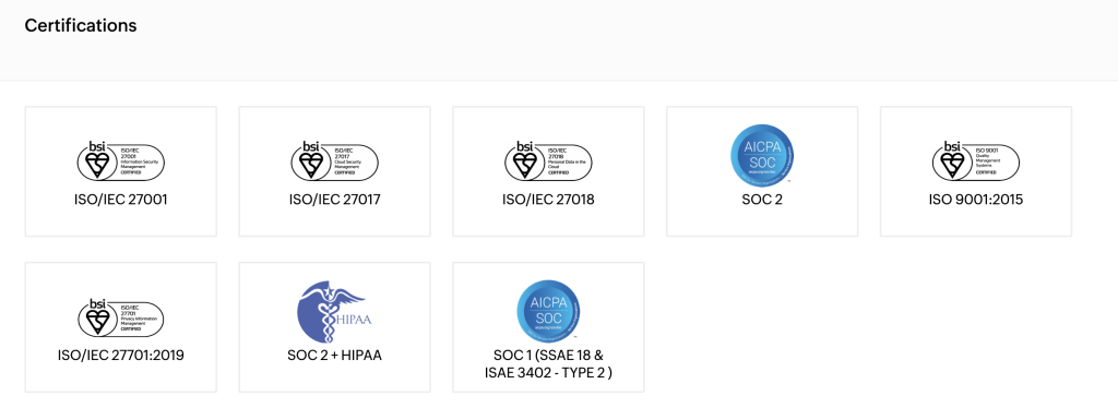 Compliance Certifications At Zoho, we comply with the following industry-accepted standards to help you ensure the security and compliance of your data. Our partnership with Zoho provides additional assurance through their extensive certification portfolio, including ISO/IEC 27001:2013, ISO/IEC 27017:2015, ISO/IEC 27018, SOC 2 Type II, ISO 9001, SOC 2 + HIPAA, ISO/IEC 27701, and SOC 1 Type II compliance, ensuring that our data handling practices meet the highest international standards for security, privacy, and quality management.