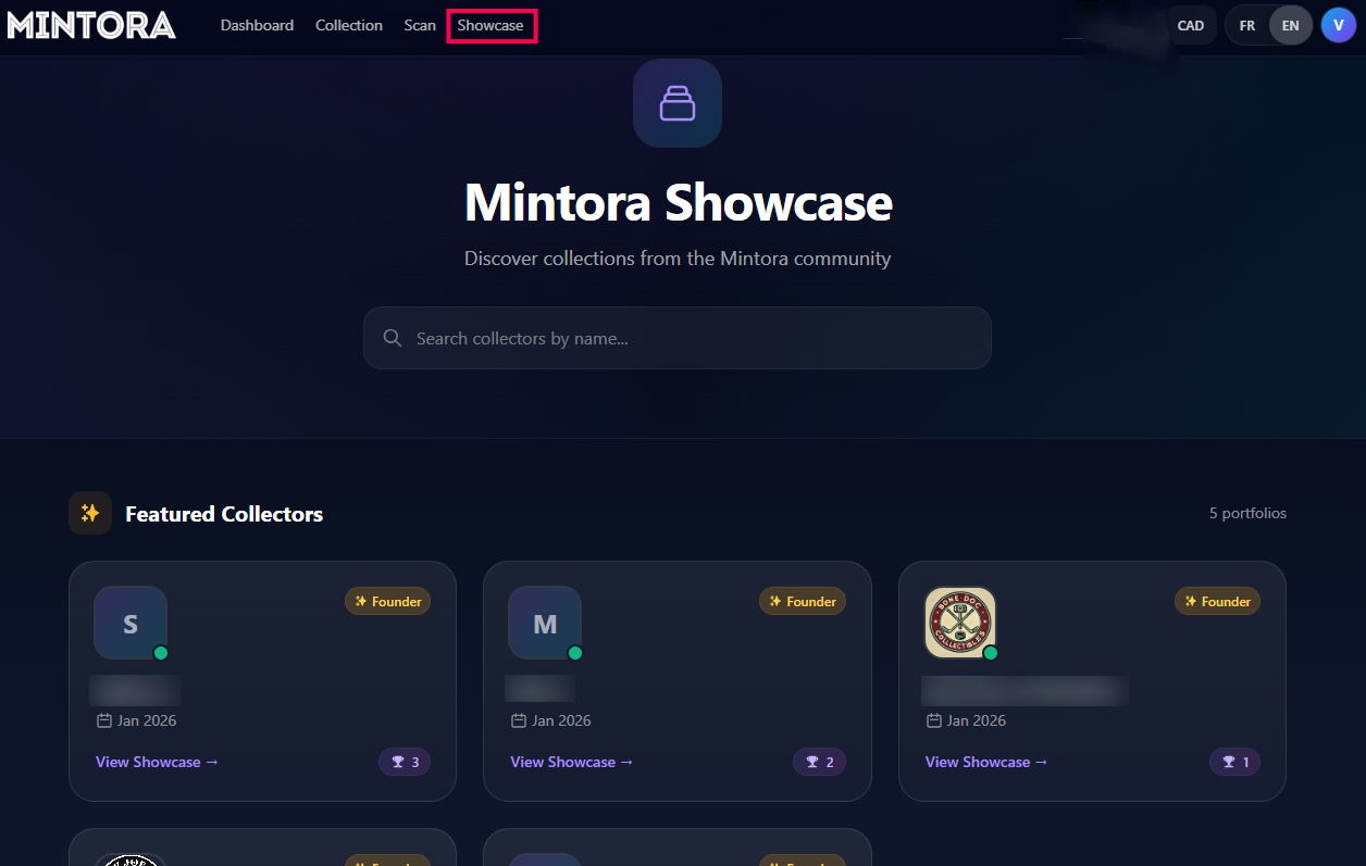 The Showcase page lets you highlight and share your collection with others. It’s a public-facing space where you can present your cards, showcase your portfolio, and let the community discover what you own.